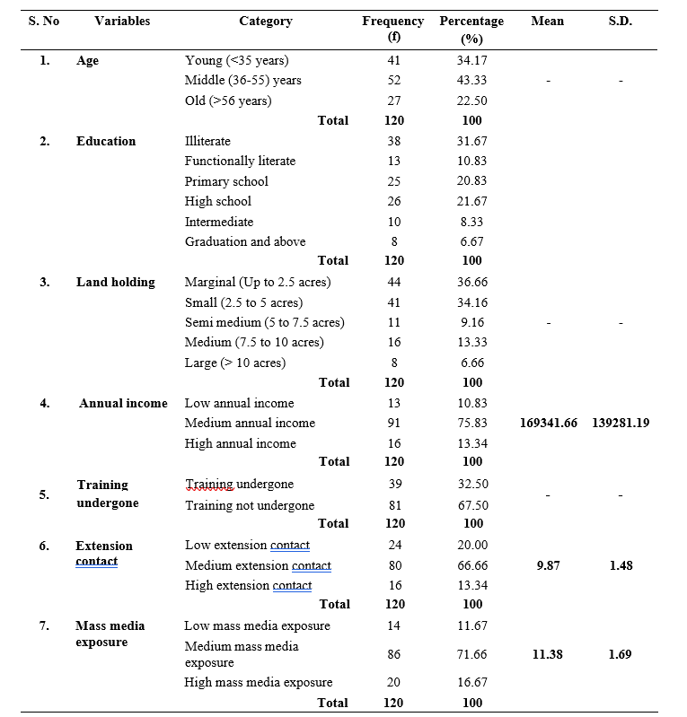 It was noticed from Table 1, that majority (71.66%) of the respondents had medium mass media exposure, followed by those with high (16.67%) and low (11.67%) of mass media exposure respectively. The findings indicated that, medium portion of farmers have access to information through media such as radio, television and mobile phone, their usage was often irregular or limited to general content. This finding was in conformity with the findings of Mukesh (2017) and Neha (2022).