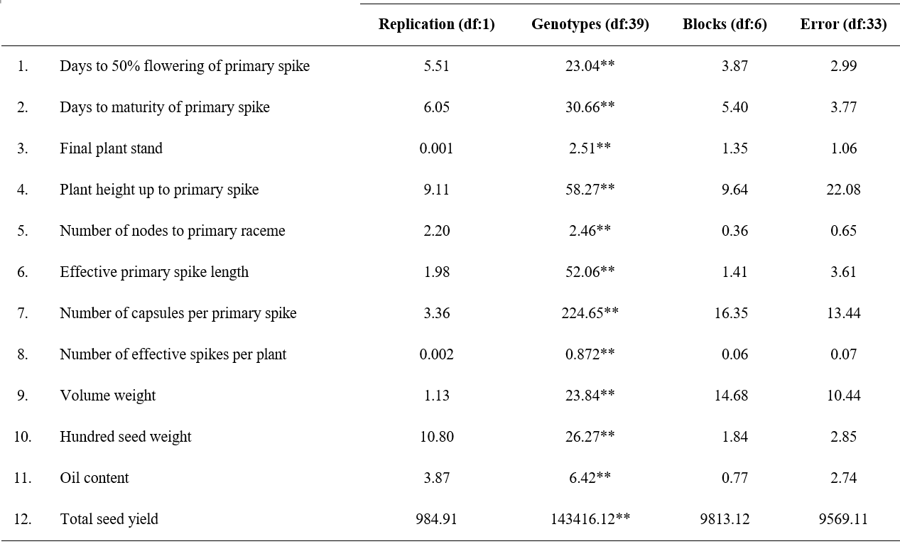 The results are in consonance with the findings of Rukhsar et al. (2018) for days to 50% flowering of primary spike, Deepak et al. (2024) for Days to maturity of primary spike. Abimiku et al. (2012), Getinet et al. (2014) and Dapke et al. (2016) for plant height up to primary spike. Getinet et al. (2014) and Rukhsar et al. (2018) for number of nodes to primary spike. Dapke et al. (2016) for effective primary spike length. Deepak et al. (2024) for number of capsules per primary spike. Halilu et al. (2013) and Rukhsar et al. (2018) for number of effective spikes per plant. Yamanura and Kumar (2020) for hundred seed weight. Rajavardhan et al. (2023) and Deepak et al. (2024) for total seed yield. Yamanura and Kumar (2020) and Rajavardhan et al. (2023) for oil content.