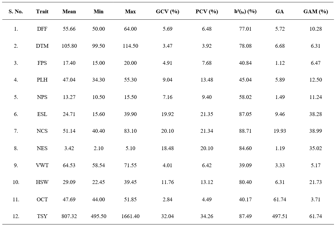 The success of plant breeding hinges on the existing genetic variability within the crop (Zheng et al., 2010). Assessing and estimating genetic variability in the germplasm is crucial before initiating any crop improvement program or selecting appropriate breeding techniques. This analysis aids in developing high- yielding and high-quality cultivars, ultimately increasing production. Heritability plays a key role in determining the transmissibility of traits to future generations, which is vital for selecting component traits to improve yield. Heritability estimates, along with genetic advances, are more reliable in predicting the genetic gain achieved via selection compared to heritability estimates alone.