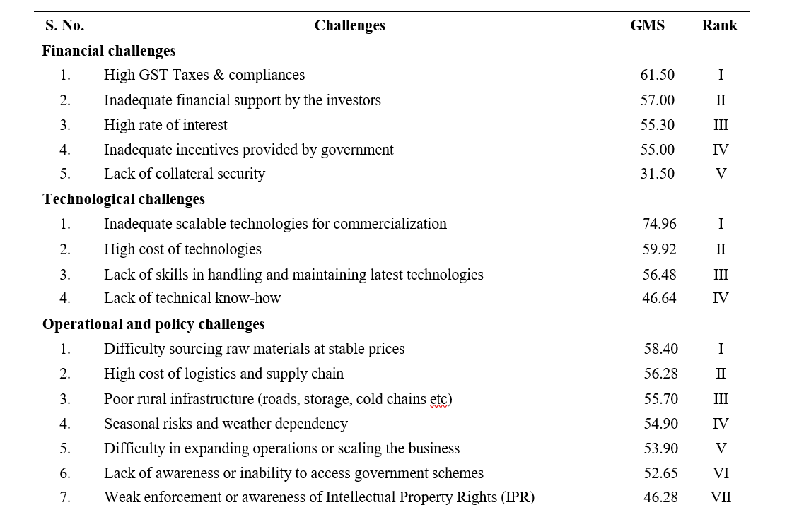 Among operational and policy challenges it is revealed that, difficulty in sourcing raw materials at stable prices was ranked highest (Rank I) with Garett mean score (58.40), followed by high cost of logistics and supply chain (Rank II) poor rural infrastructure (roads, storage, cold chains etc) (Rank III). seasonal risks and weather dependency (Rank IV), difficulty in expanding operations or scaling the business was ranked fifth (Rank V). lack of awareness or inability to access government schemes came sixth (Rank VI), and the lowest-ranked issue was Weak enforcement or awareness of Intellectual Property Rights (Rank VII).