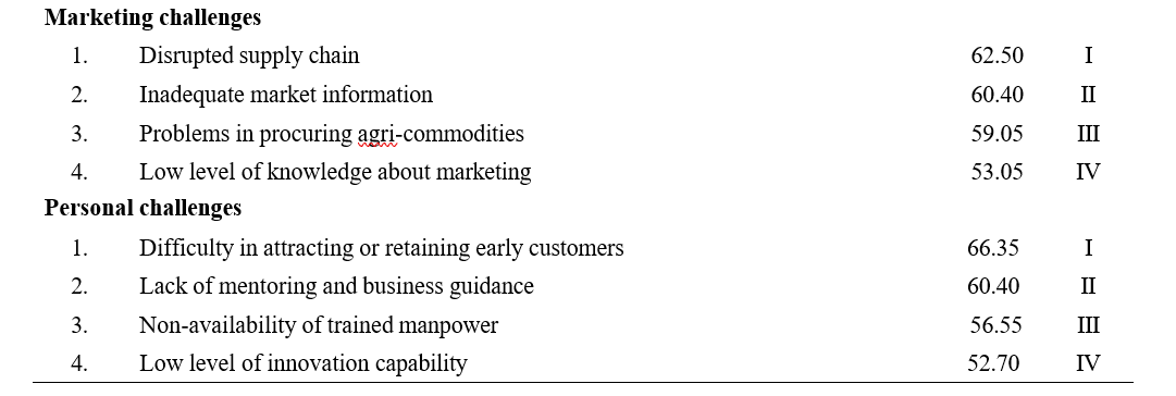 With regards to marketing challenges, the descending orders of the ranked challenges include: disrupted supply chain was the most pressing concern (Rank I) with Garett mean score (62.40), inadequate market information (Rank II), problems in procuring agri-commodities (Rank III), and low level of knowledge about marketing (Rank IV).
