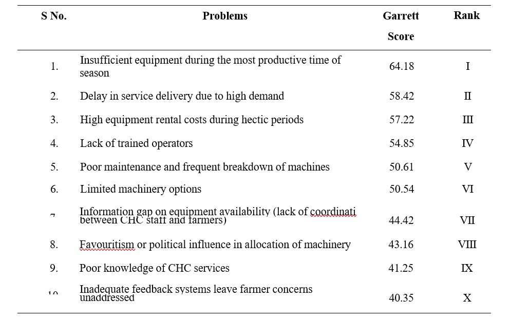 Insufficient equipment during the most productive time of season was the most listed problem (Garrett Score: 64.18), leading to unmet demand and delayed operations. This was followed by delay in service delivery due to high demand (Score: 58.42) and high equipment rental costs during hectic periods (Score: 57.22), which deter smallholders from utilizing CHC services. Other significant constraints included the lack of trained operators (Score: 54.85), and Poor maintenance and frequent breakdown of machines (Score: 50.61), affecting service reliability. (Meena et al. 2018 and Sharma et al. 2022)