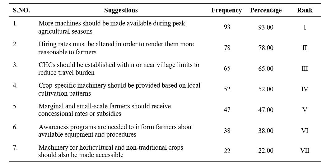 Addressing these challenges requires enhancing the availability of machinery during peak agricultural seasons (93.00%) and rationalizing rental rates to ensure affordability for small and marginal farmers (78.00%). Further recommendations included establishing CHCs within or near village limits (65%) and provision of crop- specific machinery based on local cultivation patterns (52.00%). Overall, the results emphasize the necessity of improving equipment availability, enhancing operational efficiency, and strengthening farmer awareness to ensure the effective functioning of CHCs.