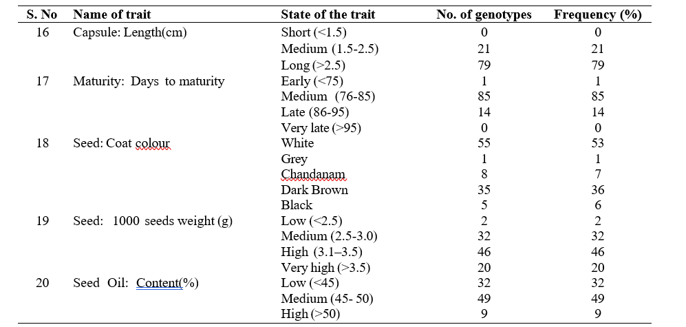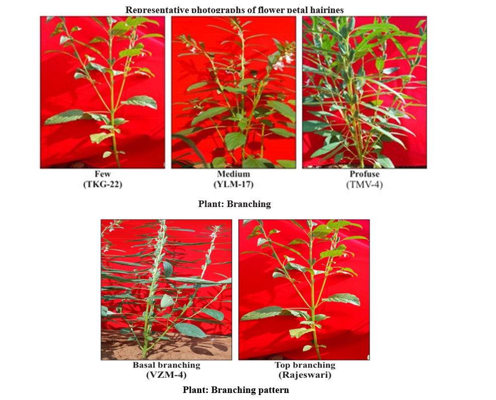 The present investigation was carried out in Regional Agricultural Research Staton, Tirupati during rabi 2024-2025 with 100 genotypes evaluated in two replications using Alpha Lattice Design. Each genotype was sown in two rows in three meters length. The recommended agronomical practices and plant protection measures were followed for raising successful crop. DUS characterization was done as per the guidelines developed by PPV & FR act, India. Observations were recorded on twenty DUS descriptors viz., days to 50% flowering, petal colour, petal hairiness, height of the stem (cm), branching, branching pattern, stem hairiness, leaf lobes, leaf size, leaf serration, capsule hairiness, locules per capsule, capsule shape, capsule per axil, capsule arrangement, capsule length (cm), days to maturity, seed coat colour, test weight and oil content.
