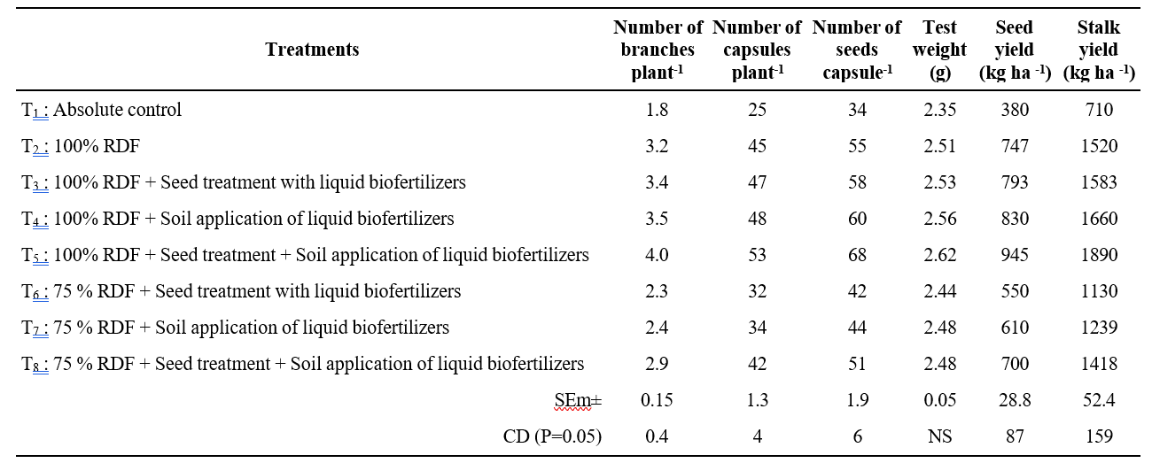treatment + soil application of liquid biofertilizers(T5). The next best treatments in recording higher yield were application of 100 % RDF + soil application of liquid biofertilizers(T4), application of 100 % RDF + seed treatment with liquid biofertilizers (T3) and application of 100 % RDF (T2) in the order of descent with no significant disparity between them. However, comparable yields were obtained from 100 % RDF (T2) and 75 % RDF + seed treatment + soil application of liquid biofertilizers(T8). It shows the yield advantage with the application of liquid biofertilizers by partial substitution of inorganic fertilizers. Application of 75% RDF + soil application of liquid biofertilizers(T7) and application of 75 % RDF + seed treatment with liquid biofertilizers (T6) were comparable with one another and both of them were significantly superior over the absolute control(T1). The lowest yield was associated with the absolute control(T1). It might be attributed to the combined application of inorganic fertilizers and liquid biofertilizers that increased availability of nitrogen, phosphorus and potassium in the root zone through atmospheric nitrogen fixation by Azospirillum and solubilization of unavailable phosphates and potassium by PSB and KSB respectively which in turn resulted in the better nutrient uptake and accelerated photosynthetic rate, adequate biomass production that further facilitated the efficient translocation of photosynthates from source to sink there by increasing the sink capacity resulting in the improved yield attributes and ultimately increased the yield of sesame. These results are supported by Sahoo et al. (2010), Lakhran et al. (2015), Aglawe et al. (2021), Shaik et al. (2010) and Gabhane et al. (2018).