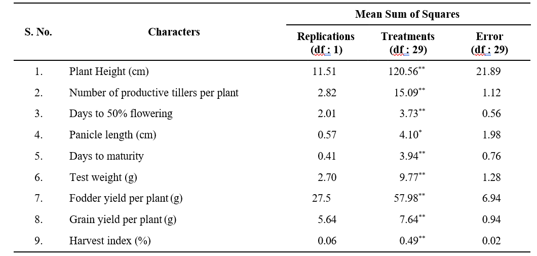 Analysis of variance was carried out for nine yield and yield attributing traits viz., plant height, number of productive tillers per plant, days to 50% flowering, panicle length, days to maturity, fodder yield, test weight, grain yield and harvest index is represented in Table.1 The results revealed significant differences among the studied genotypes for all the traits which indicate the