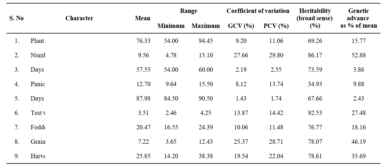 High PCV was recorded for number of productive tillers per plant (29.80) followed by grain yield per plant (28.71) and harvest index (22.04). Moderate PCV was recorded for test weight (14.42) followed by panicle length (13.74), fodder yield per plant (11.48) and Plant height (11.06).