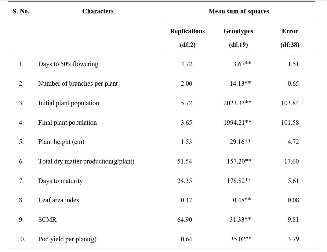 College, Tirupati, Andhra Pradesh during rabi, 2024-25. The field trial was laid out in Randomized Block Design (RBD) with twenty genotypes and replicated thrice, with a spacing of 22.5 cm between the rows and 10 cm between the plants within a row, with row length of 5 m and four rows. The morpho-physiological traits studied in the field were days to 50 % flowering, number of branches per plant, initial and final plant population per plot, plant height, total dry matter production per plant, days to maturity, leaf area index and SCMR. The various plant components were picked and dried in a hot air oven at 80 °C until they reached a consistent weight in order to determine the Total dry matter production (TDMP). The leaf area index was calculated by dividing the total leaf area by the corresponding ground area. SPAD chlorophyll meter reading (SCMR) was measured on five randomly selected plants from each genotype in each replication at 60 DAS using Minolta SPAD-502 chlorophyll meter and the measurements were taken on the third leaf from the terminal bud of main axis. The data recorded were analysed statistically using OPSTAT software by adopting Randomized Block Design (RBD) with three replications for field experiment as described by Panse and Sukhatme (1985). The standard error of difference was calculated at 5 and 1 per cent probability levels to compare the mean difference among the treatments.