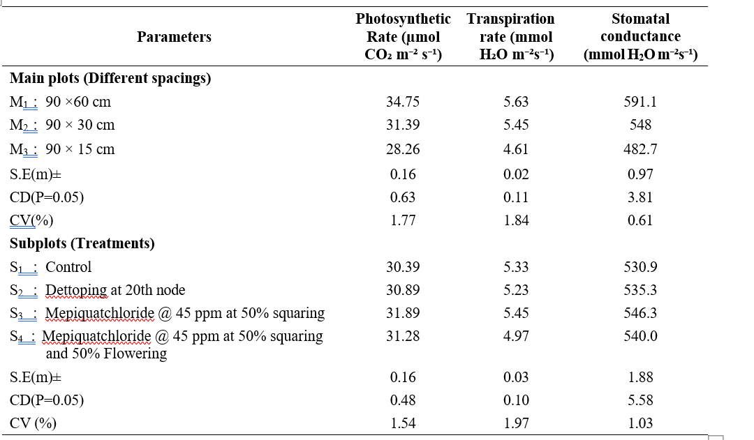 boll production per unit area. Among PGR treatments, S3 (mepiquat chloride at 50% squaring) recorded the highest number of bolls per plant (33.0), suggesting that mepiquat chloride improved boll retention and reduced shedding. Khan et al., (2016), reported that closer spacing combined with mepiquat chloride application increased boll number by enhancing effective fruit set and retention.The results clearly demonstrated that high- density planting and application of mepiquat chloride at 45 ppm during flowering significantly improved key yield parameters in cotton. While boll weight was slightly lower under dense spacing, the overall gains in boll number, lint yield, and seed cotton yield compensated effectively. The combination of optimized plant population and canopy regulation using PGRs is a viable strategy to improve productivity in HDPS cotton cultivation. The study confirms that wider spacing and the use of mepiquat chloride at 50% flowering significantly improved gas exchange parameters in cotton. These findings emphasize the potential of optimized plant architecture and growth regulator use to enhance photosynthesis and water use efficiency under High-DensityPlanting System. Strategic manipulation of canopy structure through spacing and PGRs can lead to better physiological performance and potentially higher yield in cotton crop.