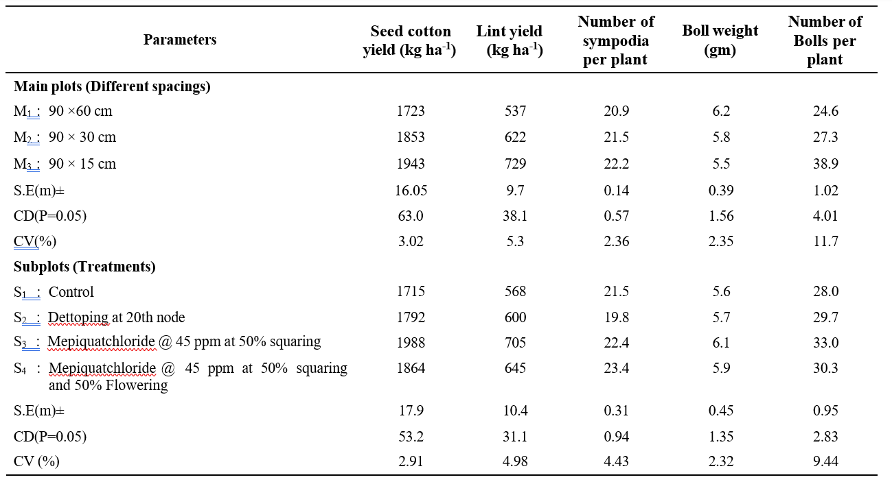 The number of sympodia per plant, was significantly influenced by plant spacing and growth regulator treatments. (Table 2) Closer spacing (M3) recorded the highest number of sympodia (22.2), suggesting that higher plant density promoted reproductive branching. Among treatments, S4 (split application of mepiquat chloride at squaring and flowering) showed the highest number (23.4), indicating its effectiveness in canopy management and enhancing fruiting branch development. Saleem et al., (2017), noted that growth retardants like mepiquat chloride improve sympodial branching by regulating internode elongation. Boll weight was negatively affected by increasing plant density, with the widest spacing (M1) recording the highest boll weight (6.2 g), while the closest spacing (M3) had the lowest (5.5 g), likely due to reduced assimilate availability per boll. (Table: 2). Among growth regulator treatments, S3 (mepiquat chloride at squaring) showed the highest boll weight (6.1 g), indicating improved source-sink balance and efficient boll filling. Ramegowda et al., (2014), reported enhanced boll weight with mepiquat chloride application due to better allocation of photosynthesis.