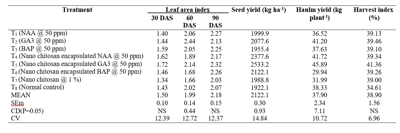 No significant difference was observed among all treatments in HI. Maximum harvest index was recorded in T5 (Nano chitosan encapsulated GA3 @ 50 ppm) 41.36 % and minimum was observed in T8 (control) 34.61 %. A rise in harvest index could be attributed to the synchronized interaction between growth and developmental characteristics (Chande et al., 2021).