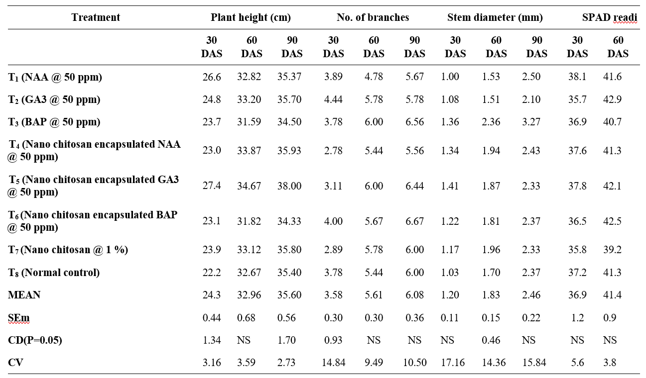 T4 – Nano chitosan encapsulated NAA @ 50 ppm T5 – Nano chitosan encapsulated GA3 @ 50 ppm T6 – Nano chitosan encapsulated BAP @ 50 ppm T7 – Nano chitosan @1 %