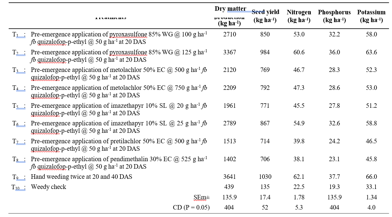 A field trial was conducted during rabi, 2024- 25 at Dryland Farm of S.V. Agricultural College, Tirupati campus of Acharya N.G. Ranga Agricultural University, Andhra Pradesh. The experimental field was characterized by sandy loam soil. Available nitrogen, phosphorus and potassium were 154, 26.3 and 185 kg ha-1, respectively. The experiment was designed in a randomized block design with ten treatments and three replications. The treatments comprised of pre-emergence (PE) application of pyroxasulfone 85% WG @ 100 g ha-1 fb quizalofop-p-ethyl @ 50 g ha-1 at 20 DAS (T1), pyroxasulfone 85% WG @ 125 g ha-1 fb quizalofop-p- ethyl @ 50 g ha-1 at 20 DAS (T2), metolachlor 50% EC 500 g ha-1 fb quizalofop-p-ethyl @ 50 g ha-1 at 20 DAS (T3), metolachlor 50% EC 750 g ha-1 fb quizalofop-p- ethyl @ 50 g ha-1 at 20 DAS (T4), imazethapyr 10% SL 20 g ha-1 fb quizalofop-p-ethyl @ 50 g ha-1 at 20 DAS (T5), imazethapyr 10% SL 25 g ha-1 fb quizalofop-p-ethyl @ 50 g ha-1 at 20 DAS (T6), pretilachlor 50% EC 500 g ha-1 fb quizalofop-p-ethyl @ 50 g ha-1 at 20 DAS (T7), pendimethalin 30% EC 525 g hafb quizalofop-p-ethyl @ 50 g ha-1 at 20 DAS (T8), hand weeding twice at 20 and 40 DAS (T9) and weedy check (T10). The variety ‘Sarada’ (YLM-66) was sown by broadcasting on January 3rd. The recommended fertilizer dose of 40:20:20 kg ha⁻¹ of N, P₂O₅ and K₂O was applied. Pre-emergence and post emergence herbicides were applied at 1 and 20 DAS respectively by using spray fluid @ 500 l ha-1 with the help of knapsack sprayer fitted with flat fan nozzle. All other recommended agronomic practices were followed as per crop requirements. At harvest, composite plant samples of both the crop and associated weeds were collected from each plot. These samples were dried, ground finely, and nitrogen, phosphorus, and potassium content were analyzed following the standard procedures outlined by Jackson (1973). Nutrient uptake by the crop and weeds was calculated by multiplying the respective nutrient concentrations with their corresponding dry matter weights and expressed as kg ha-1.