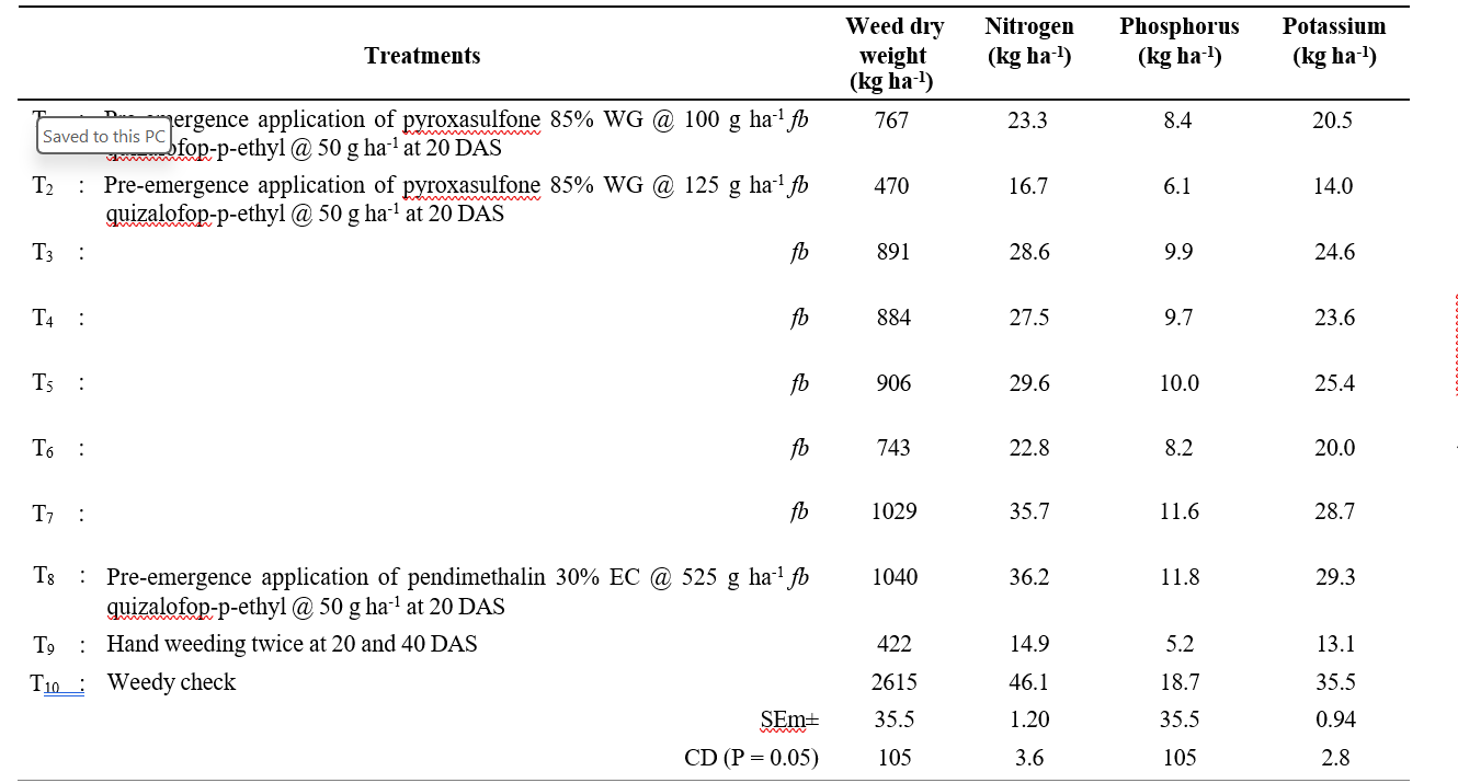An inverse relationship between nutrient uptake by the crop and the associated weeds was found in this study. Lower uptake of nutrients by weeds was noticed in hand weeding twice at 20 and 40 DAS (T9). This result was in line with results of Kamani et al. (2019). Manual removal of weeds at 20 and 40 DAS controlled the weeds and reduced its density and dry weight thus, resulted in lower nutrient uptake by weeds. This treatment was statistically comparable to the pre-emergence application of pyroxasulfone at 125 g ha⁻¹ fb quizalofop- p-ethyl at 50 g ha⁻¹ (T2). This was due to, control of weeds for longer crop growth periods contributed to less density and dry weight of weeds and finally reduced the uptake of nutrients by weeds. These results were in conformity with Mruthul et al. (2015). Higher uptake of N, P and K by weeds was with weedy check (T10), which was significantly higher than the remaining weed management practices due to uncontrolled weed growth. These results were similar with results of Bhaumik et al. (2023).