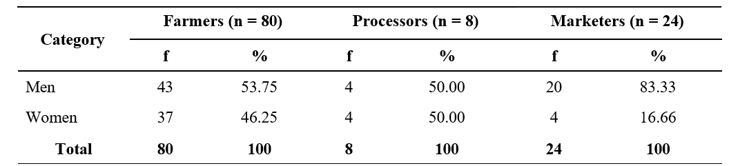 The data presented in Table 1 indicated that banana cultivation showed relatively balanced participation between men and women. Out of eighty respondents, 53.75 per cent were men and 46.25 per cent were women. This indicated that farming was slightly male-dominated, though both men and women were actively involved. In the processing sector men and women were almost