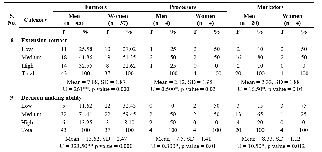 Majority (41.86%) of the male banana growers had medium level of extension contact followed by high (32.55%) and low (25.58%) level of extension contact. Whereas, majority (51.35%) of the female banana growers had medium level of extension contact followed by low (27.02%) and high (21.62%). In the processing sector, half (50.00%) of male processors reported a medium level of extension contact. An equal proportion (25.00%) of male respondents had low and high levels of extension contact, respectively. In contrast, women engaged in banana processing exhibited medium to low (each 50.00%) level of extension contact. In marketing, among the male marketers, a majority (80.00 %) had a medium level of extension contact, followed by an equal proportion (10.00 % each) with low and high levels of contact. In contrast, female marketers reported a medium to low (each 50%) level of extension contact. The Mann- Whitney U test revealed that the men and women in banana value chain were significantly different in terms of their extension contact. This could be attributed to issues such as the untimely availability of support and services from the extension system. The low level of extension contact among female respondents was likely due to limited access and infrequent interactions, stemming from resource constraints, logistical challenges, and geographic remoteness. Other stakeholders had minimal interaction with formal extension services, relying mostly on peers for agricultural information, likely due to low awareness and limited access to resources like business incubation centres. The results were in accordance with Bhavani (2023) and Rooh (2023).