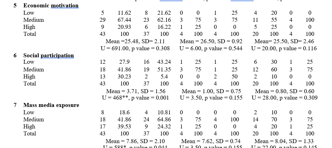 25.00 per cent each had medium and low level of social participation. In marketing sector, majority of the men had medium (60.00%) level of social participation followed by low (30.00%) and high (10.00%). Among women three-fourth (75.00%) of them had medium level followed by low (25.00%) level of social participation. The Mann-Whitney U test revealed that male and female banana farmers differed significantly in terms of their social participation, whereas no significant differences were observed among processors and marketers. Farmers had formal organizations like FPOs and SHGs that enhanced their social participation, while processors and marketers lacked such structures. However, SHGs with value addition units played a role in improving social participation among women processors. The findings were in accordance with Murugan (2017).