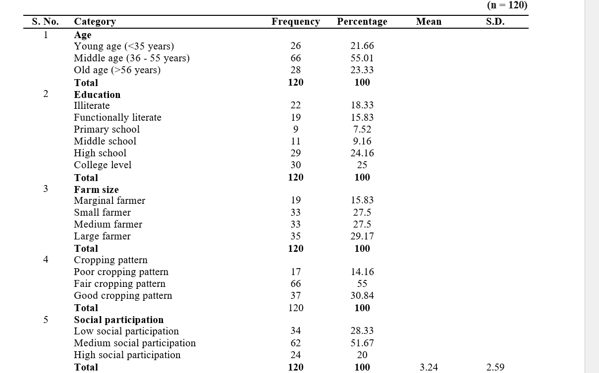 About (25.00%) of the millet growers were educated up to college level followed by high school (24.16%), illiterate (18.33%), functionally literate (15.83%), middle school (9.16%) and primary school (7.52%) level of education. This above trend might be due to the fact that educational facilities in villages were strengthened and villages were having accessibility to high schools and colleges, good transport facilities in villages and the availability of schools and colleges nearby them. Only very few millet growers had stopped their education up to middle school and the reason might be due to lack of awareness about importance of higher education among family members in the villages. Another plausible reason was the poor economic condition of the millet growers who made their children take up agriculture. This finding was in accordance with the findings of Chavhan (2020), Anilkumar (2021) and Patnaik (2024).
