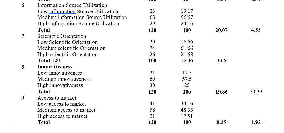 About 61.66 per cent of the millet growers had medium level of scientific orientation, followed by high (21.68%) and low (16.66%) level of scientific orientation. The farmers being considerably educated might be the reason for the above trend. The farmers should adopt scientific management practices to make good economic yield from the farm. Proper post-harvest handling of the produce is essential to market millets profitably. Hence, farmers had to perceive things scientifically to overcome such challenges. And the low scientific orientation might be due to the reason that majority of the farmers being old were continuing the farming practices which were followed by their forefathers. This finding was in accordance with the findings of Priya (2015) and Tankodara et al. (2022).