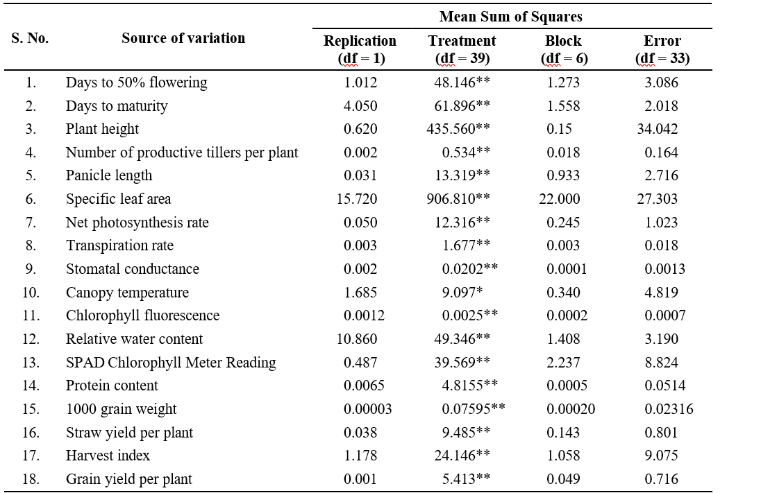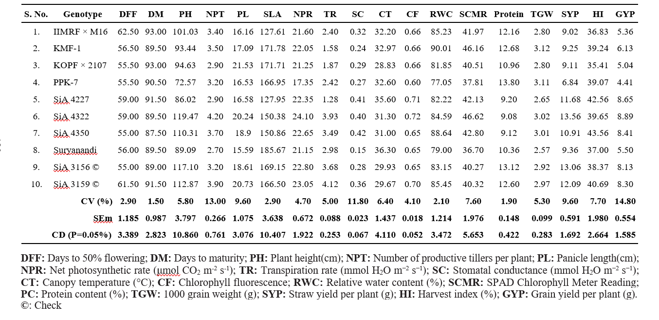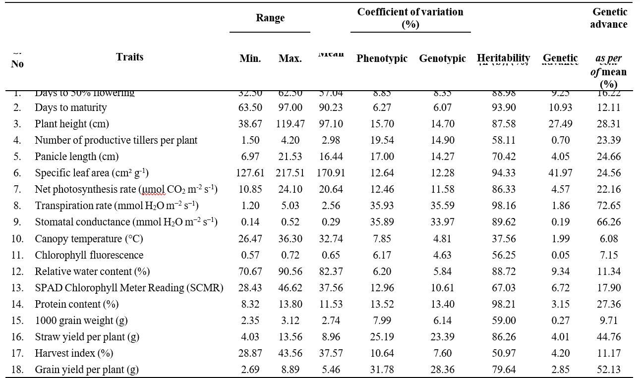 In the present research work significant differences were noticed in the mean values for all the traits. The mean performance of traits viz., days to 50% flowering is ranged from 32.50 (SiA 3222) to 62.50 (IIMR FxM 16), days to maturity is ranged from 63.50 (SiA 3222) to 97.00 (SiA 4276), plant height is ranged from 38.67 cm (SiA 3222) to 119.47 cm (SiA 4322), number of productive tillers per plant is ranged from 1.50 (SiA 3222) to 4.20 (SiA 4322), panicle length is ranged from 6.97 cm (SiA 3222) to 21.53 cm (KOPFx 2107), specific leaf area is ranged from 127.61 cm2g-1 (IIMR FxM 16) to 217.15 cm2g-1 (SiA 4348), net photosynthetic rate is ranged from 10.85 μmol CO2 m-2 s-1 (SiA4315) to 24.10 μmol CO2 m-2 s-1 (SiA 4322), transpiration rate is ranged from 1.20 mmol H2O m−2 s−1 (SiA 4315) to 5.03 mmol H2O m−2 s−1 (SiA 4258), stomatal conductance is ranged from 0.14 mmol H2O m−2 s−1 (SiA 4331) to 0.14 mmol H2O m−2 s−1 (SiA 4279), canopy temperature is ranged from 26.47°C (SiA 4262) to 36.30°C (Suryanandi), chlorophyll fluorescence is ranged from 0.57 (SiA 3222) to 0.72 (SiA 4322), relative water content is ranged from 70.67% (SiA 4252) to 90.56% (SiA 4231), SPAD chlorophyll meter reading is ranged from 28.43 (SiA 3222) to 46.62 (SiA 4322), protein content is ranged from 8.32% ( SiA 4338) to 13.80% (PPK 7), 1000 grain weight is ranged from 2.35 g (SiA 4320) to 3.12 g (KMF 1), straw yield per plant is ranged from 4.03 g (SiA 3222) to 13.56 g (SiA 4322), harvest index is ranged from 28.87% (SiA 4326) to 43.56% (SiA 4350), grain yield per plant is ranged from 2.69 g (SiA 3222) to 8.89 g (SiA 4322).