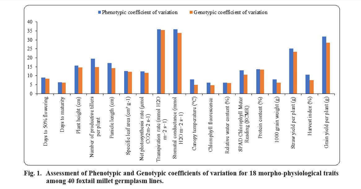 Drought resilience studies in foxtail millet focus on understanding the genetic and physiological mechanisms that allows this crop to survive and thrive under water- deficient conditions and ensures food security in regions vulnerable to drought by developing tolerant varieties that can withstand and acclimatize to water paucity. Foxtail millet yields and productivity are generally influenced by various morpho-physiological traits like number of productive tillers, panicle length, primary branches, effective photosynthesis, leaf chlorophyll content, chlorophyll fluorescence, harvest index, drought and heat tolerance, resistance to pests and diseases. Trait- based breeding can enhance productivity and climate resilience, ensuring food security in drought-prone areas. This research aims to assess genetic variability among diverse foxtail millet genotypes to identify high- performing lines and develop an effective selection strategy for enhancing yield and adaptability.