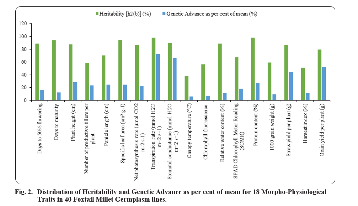 In conclusion, the traits such as transpiration rate, stomatal conductance, straw yield per plant and grain yield per plant indicated the presence of high variability, heritability and genetic advance as per cent of mean conforming sufficient variability and are primarily controlled by additive gene effects with minimal environmental influence, thus these traits are more amenable for direct selection. Therefore, it would be beneficial to place greater attention on selecting these traits for rapid improvement of grain yield in foxtail millet.