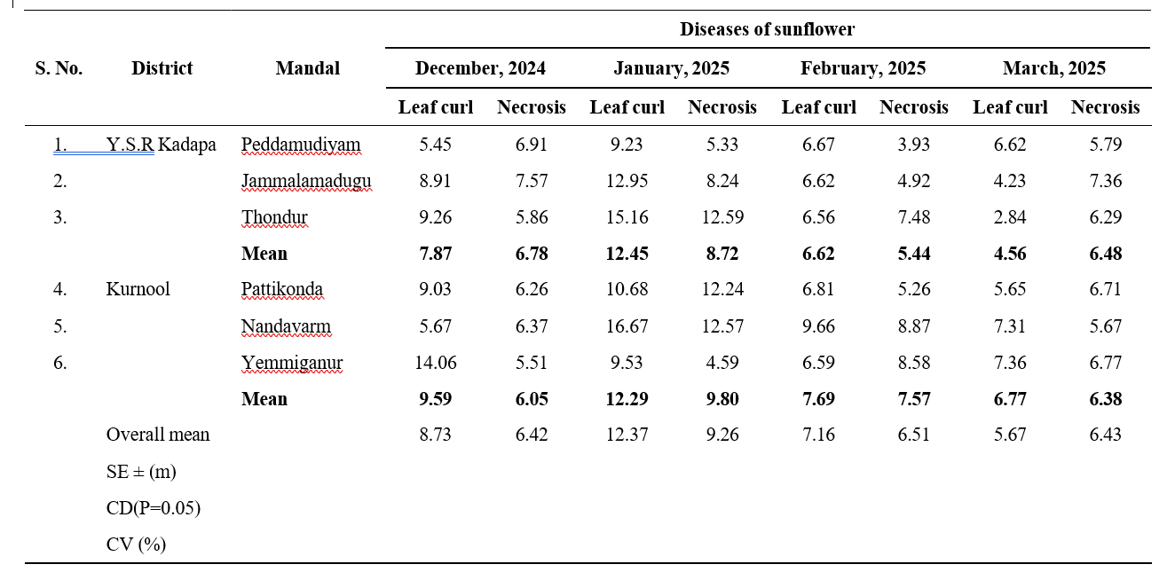 Table: 3 Incidence of viral diseases of sunflower in Y.S.R Kadapa and Kurnool district of Andhra Pradesh during rabi, 2024-2025