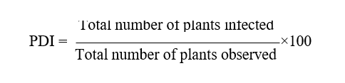 The incidence of the disease was recorded during the survey on naturally infected plants by using following equation as suggested by Wheeler (1969). The zigzag pattern is followed to collect required data in which ten randomly selected plants were evaluated at each location.