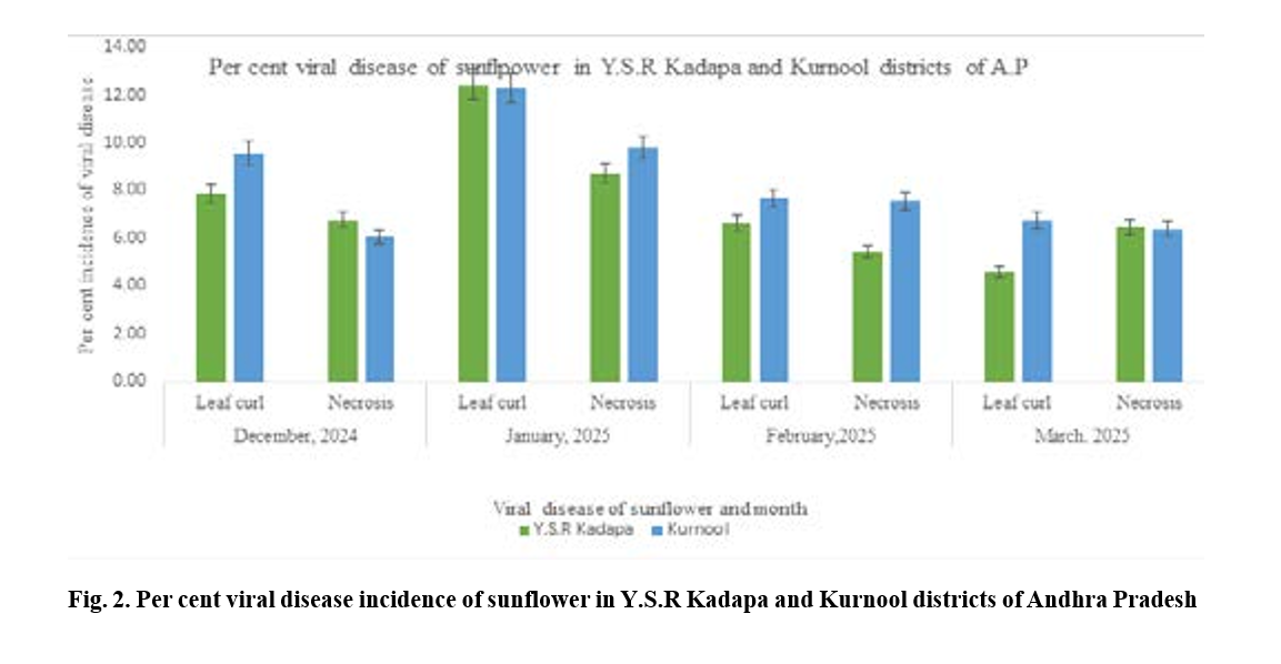 A roving survey was carried out in sunflower cultivating areas of Y.S.R Kadapa and Kurnool districts of Andhra Pradesh during rabi, 2024 to know the incidence of sucking pests complex and incidence of viral diseases in sunflower. From the selected districts, different mandals, viz., Thondur, Jammalamadugu, Peddamudiyam, Pattikonda, Yemmiganur and Nandavaram were surveyed randomly for the incidence of sucking pests and viral diseases at crop growth period. Results revealed that whitefly and leafhopper population were more when compared to thrips. The highest mean number of whitefly population per six leaves was recorded in mandal of Thondur (8.69) during the month of January in Y.S.R Kadapa district and followed by Jammalamadugu (8.36). The highest mean number of leafhopper population was recorded in mandal of Jammalamadugu (9.20) during the month of January in Y.S.R Kadapa district and followed by Peddamudiyam (8.78). The highest mean number of thrips population was recorded in mandal of Peddamudiyam (6.79) during the month of January in Y.S.R Kadapa district and followed by Jammalamadugu (6.01). The incidence of viral disease was recorded highest in Thondur mandal with 15.16 % and 12.59 % of leaf curl and necrosis diseases in Y.S.R Kadapa district respectively and among two districts surveyed the highest mean number of whiteflies, thrips and leafhopper population were noticed in Y.S.R Kadapa district. Highest incidence of leaf curl and necrosis i.e, 16.67 % and 12.57 % were observed in Nandavaram mandal of Kurnool district.