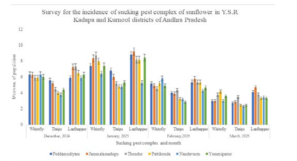 A roving survey was conducted to record the incidence of sucking pest complex in major sunflower growing areas of Andhra Pradesh during rabi season, 2024-2025. The districts covered under this study were Y.S.R. Kadapa and Kurnool districts of Andhra Pradesh during rabi from December 2024 to March 2025. From each district, three mandals and five villages from each mandal were selected based on the sunflower area. From each Village, the survey was undertaken in five farmer fields. In each location five plants were selected randomly in a field. Whitefly, thrips and leafhoppers population were counted in sunflower crop by counting the number of nymphs and adults on six leaves i.e., two at bottom, two at middle and two at the top per plant during vegetative stage to flowering stage. In order to study the symptoms of the disease, healthy sunflower plants and sunflower leaf curl infected plants were compared during roving survey from different locations. The symptoms exhibited by the diseased plants were recorded in various stages of crop growth.
