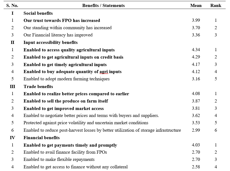 with the prompt payments facilitated by FPOs, further reinforced trust in these organizations. However, since not all FPOs are involved in the direct procurement of farm produce, the overall impact on trade benefits was somewhat limited. Financial benefits (Rank 4) were the least realized among the benefit factors. While timely payments provided some financial relief to farmers, the overall financial benefit was less pronounced, mainly because most FPOs did not offer direct financial services such as credit or flexible repayment options. The limited financial support available from FPOs suggests that there is room for growth in this area.
