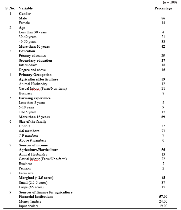Table 1 inferred that, among the sample respondents, majorly 86 per cent of sample farmers were male, 42 per cent were in the age group of more than 50 years, had secondary education (37%), while 59 per cent had agriculture/horticulture as their primary occupation,69 per cent had more than 15 years farming experience and with family size of 4-6 members (71 %). Coming to sources of income, around 56 per cent were having Agriculture/Horticulture as a primary source of income. Majority of the sample farmers were marginal with less than 2.5 acres of agricultural land (48 %). Regarding to sources of finance for agriculture, 57 % of the sample respondents had availed finance from financial institutions