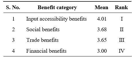Trade benefits (Rank 3) ranked third, largely due to the efforts of some FPOs to create alternative market access by directly procuring produce from member farmers. This practice allowed farmers to sell their produce conveniently on-farm, which, combined